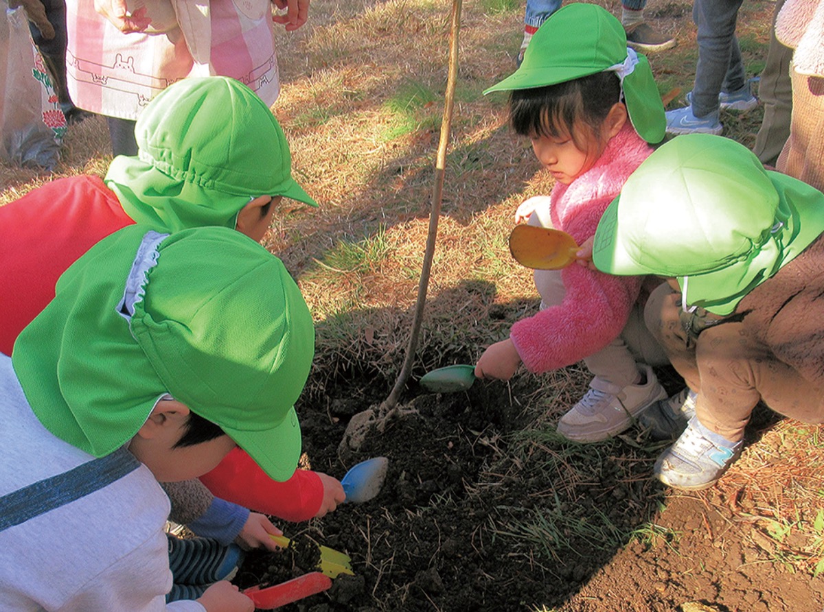 子どもたちは協力して苗木を植え穴に下ろし、シャベルで土をかぶせた。観梅会が間近に迫り、見ごろを迎えた梅林に、子どもたちからは「きれい!」などと声が上がり、一足先に梅の花を楽しんでいた。金子園長は「コロナ禍が明けて、久しぶりに地域の大人と関わるいい機会になった」と話していた。