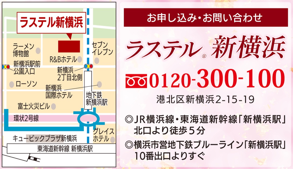 また、ラステル新横浜では3月28日(木)、午前10時30分〜正午に参加無料のセミナー「おひとり様〜知っておくこと、しりたいこと〜」を開催する。”おひとり様”がやっておきたい終活のことを終活のプロがわかりやすく解説する。要事前予約。予約・問合せは左記【フリーダイヤル】へ。