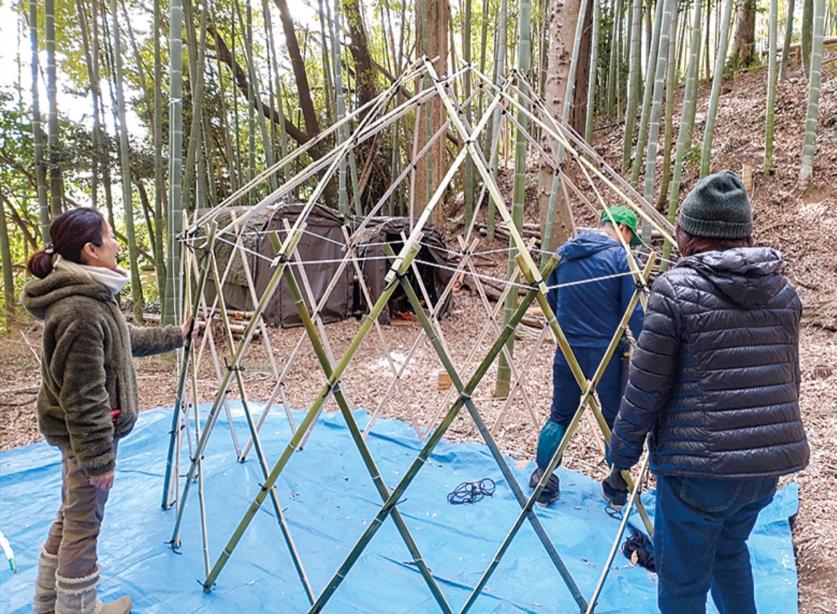 同法人は、放置竹林を整備し、間伐材の活用を図りながらまちづくり等を行っている。モンゴルの遊牧民族が使用する移動式住居「ゲル」を竹で作るワークショップは、昨年入会した下島寛さんが発案。接続部は、パームヤシの皮を原料にして撚(よ)り合わせたシュロ縄を使用し、素材はほとんど自然のものになるように考えられている。