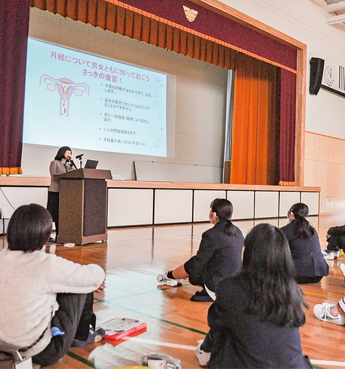 2月21日には新羽中学校で出張授業が行われ、同病院産婦人科副部長の大井由佳さんが、3年生約100人を前に講演した。大井さんはスライドを活用し、産婦人科の説明から、月経(生理)についてや妊娠のメカニズムなどをイラストやデータを見せながら解説。流産や妊産婦死亡率などにも触れ、「命を懸けて生まれてくることの奇跡」を語った。また、震災時の避難所などにおいて、生理用品の設置が必要でありながら、男性が運営に関わる事が多いことから、男子に馴染みのない内容でも、「自分事として知識を得てもらいたい」と強調。さらに人間関係や性的接触、避妊、性暴力・ハラスメントなどについても言及し、「自分の行動に責任を持つこと」を強く訴えた。