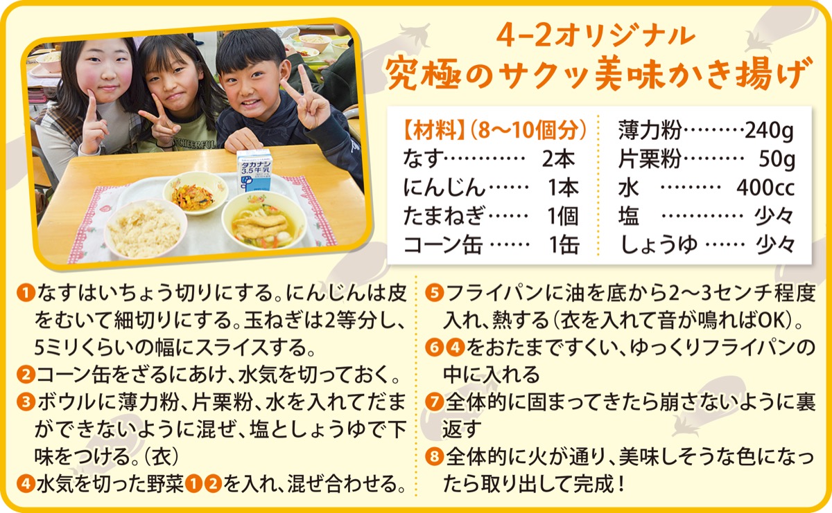 大曽根小学校(宮本雅司校長)で2月28日、児童が考えた「4─2オリジナル究極のサクッ美味かき揚げ」が給食で提供された。総合学習の一環で食品ロス問題に取り組む4年2組が、「苦手なものをおいしく食べて、給食の食べ残しを減らそう」と考案した。児童約800人にアンケートを取った結果、「苦手」という声が最も多かったナスが使われたレシピ。