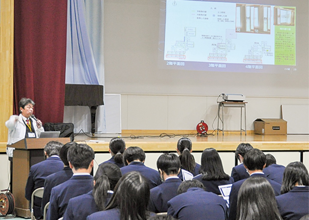 ハマ建の佐藤理事長は同校の学校運営協議会のメンバーであり、同校が11年に文部科学省の「エコスクールパイロット・モデル校」の認定を受け、校舎を改修していることなどから、今回の公開授業が実現。専門家による「脱炭素社会」や「健康な住まい」についての講義を生徒らは真剣な面持ちで聴講していた。