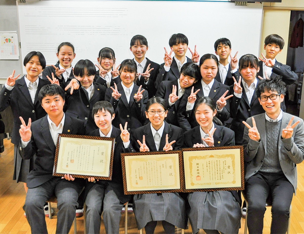 受験で3年生が抜け、1年・2年生45人で活動している同部。20人以下の構成となった県大会には2年生全員と選抜した1年生からなる「葵」と、1年生だけの「茜」のそれぞれ20人ずつの2チームで出場。「無伴奏女声合唱曲『月日貝』」と「同声(女声)合唱のための『紀の国のこどもうた3』から ことばあそびうた」の2曲を演奏した「葵」が金賞を獲得した。部長の関谷杏凜さん(2年)によれば、いつもの合唱より少ない人数になり、パート練習がうまく進まないなどの困難もあったという。「先生の指導を受け、みんなでカバーしながら乗り越えられた。金賞の結果はとても嬉しい」と関谷さん。副部長のふたり、久保菜月さん (同)と松原結花さん(同)は「曲の面白さが審査員にはまったのでは。難しい曲で、不安もあったが、ベストは尽くせた」と口をそろえる。