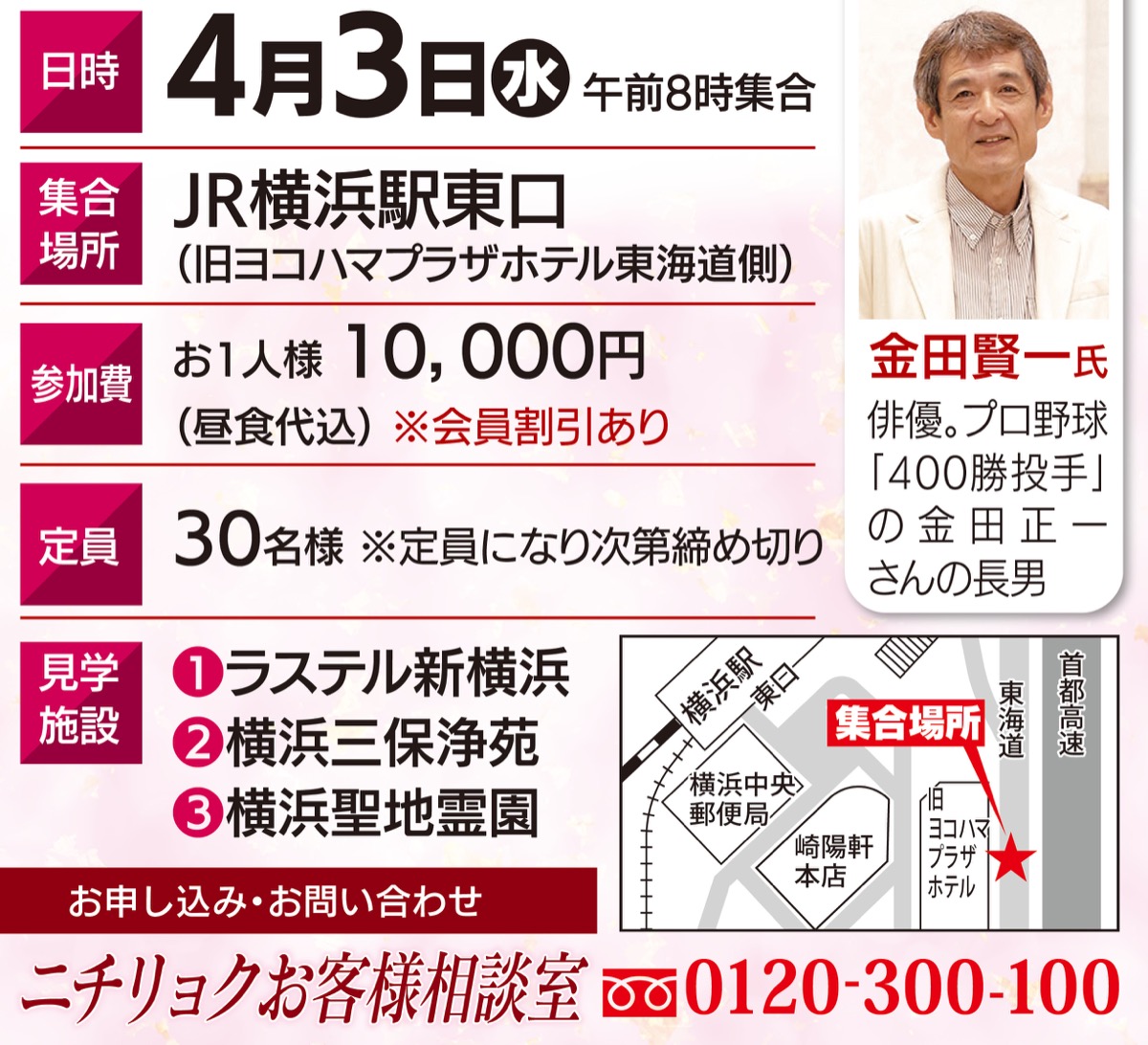 新横浜駅北口10番出口すぐにある、葬儀式場「ラステル新横浜」を運営する株式会社ニチリョクは、4月3日(水)に「春を楽しむおとなの終活バスツアーin横浜」を開催する。旅行取扱はタビットツアーズ(株)。現在参加者を募集中。
