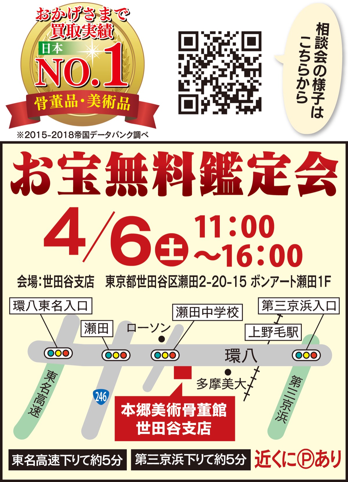 本郷美術骨董館 世田谷支店では4月6日(土)、「お宝無料鑑定会」を開催する。同店は東大赤門前で創業40年になる美術品や骨董品の専門店。経験豊富な各分野の鑑定士が27人も在籍し、様々な提案を行ってくれる。現代アート、絵画、茶道具、古美術品等あらゆるジャンルに対応できるのも魅力。TVや新聞、雑誌にも数多くとりあげられているので安心だ。特に中国美術の買取りを強化している。まずは気軽に相談を。