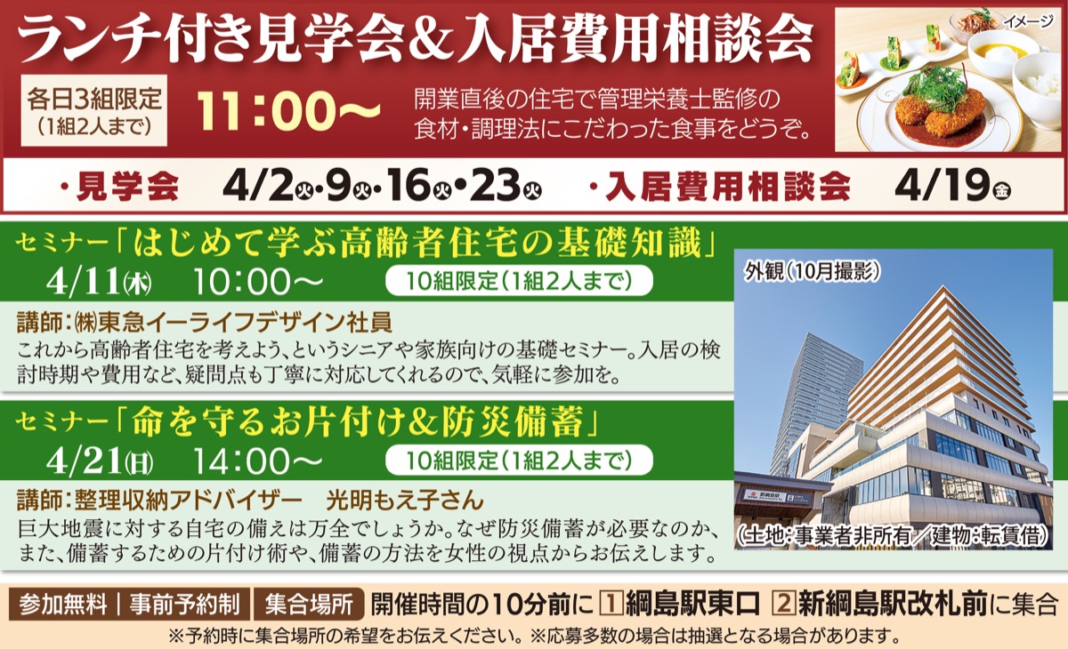 管理栄養士監修の手作り料理も人気(予約制/有料)。その美味しさを体験できる無料のランチ付き見学会や相談会、日常に役立つ無料セミナー開催中。申込は電話を。