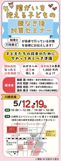 「障がいを抱える子どもの親なき後対策セミナー」が5月12日(日)・19日(日)、川崎市コンベンションホールで開催される。午前10時〜正午、午後2時〜4時。先着15人。参加費1000円。講師を務めるのは発達障がい、知的障がいの子を持つ税理士・行政書士。自らの経験を踏まえて、親なき後もわが子がお金に困らないために、今やっておきたい準備について、具体的なアドバイスが受けられる。国のセーフティネットだけでなく、より充実した生活を実現するための対策も提案してくれる。子どもと親のライフプランを専門家と一緒に考えられる貴重な機会。希望者は個別相談も可能。申込み、問合せLINEもしくは電話で。気軽に相談を。