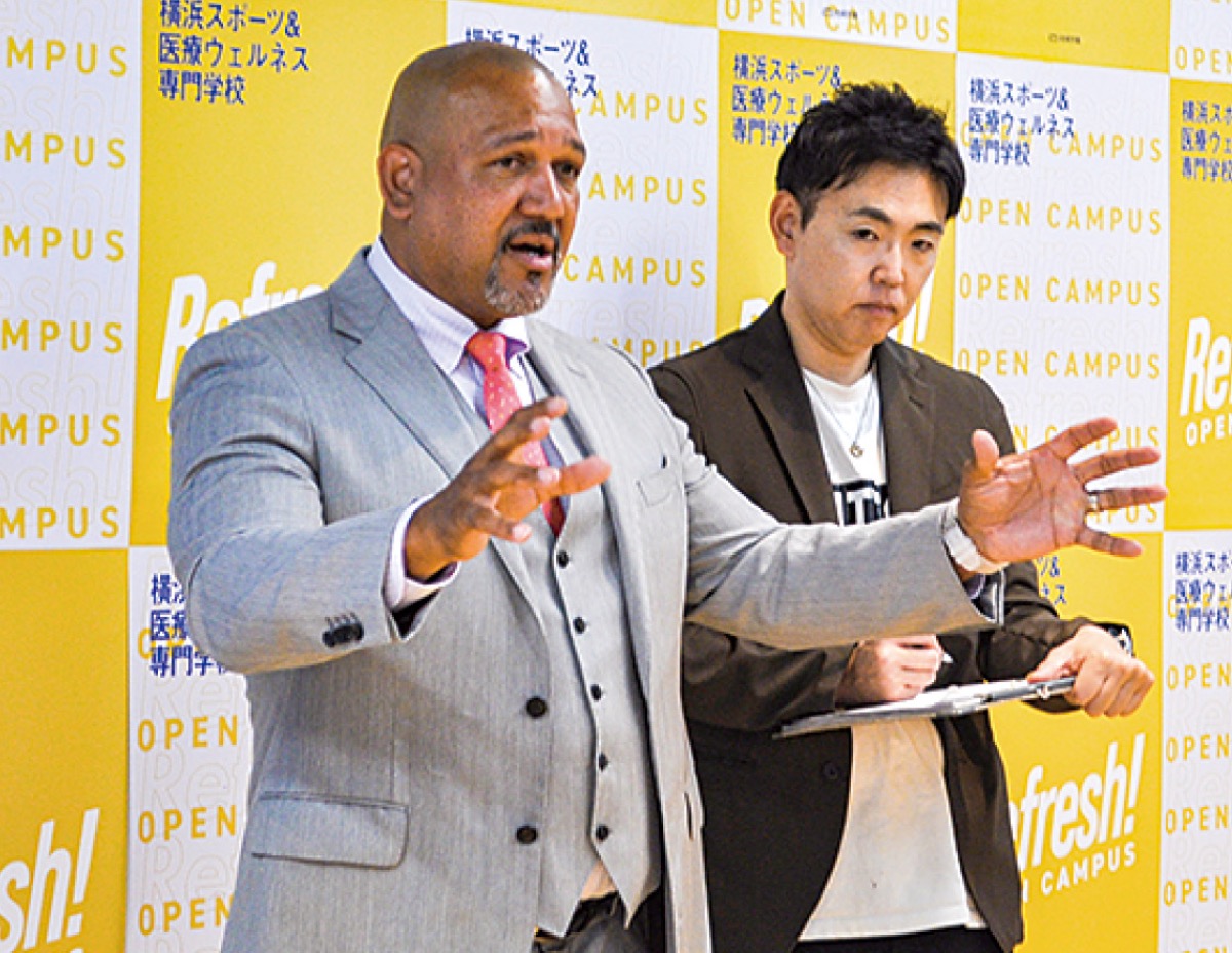 同学園はプロ野球の横浜DeNAベイスターズやバスケの横浜ビー・コルセアーズ等、県内の様々なスポーツチーム・企業と連携しており、内覧会には特別ゲストとして同学園が産学連携協定を結ぶアイスホッケーチーム「横浜GRITS」の選手と共同代表のアレックス・ラミレスさんが登場。ラミレスさんは「プロ野球選手時代に活躍できたのはトレーナーのおかげ」と話し、「トレーナーになりたい人が求める全てが揃うこの学校からプロのトレーナーが輩出されることを期待する」とした。