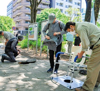 当日点検を行った新横浜3丁目の仮設トイレ用排水管は今年3月に設置されたばかりで、今回がお披露目を兼ねた初めての点検となった。参加者らは同公園内の倉庫からマンホールトイレ5基、発電機、給水ポンプ、ホースなどの備品を運び、担当者の説明を聞きながら、立ち上がり管の蓋を外してトイレを設置し、その性能を確かめた。同町内会マンション部の井手口敬輔部長は「皆さん慣れてきて、スムーズに組み立てられた。一人でも多くの人が参加できるよう今後も呼び掛けていく」と話した。また同町内会理事で、防災用品などを扱う(株)セットアップ横浜の山田紀雄さんが、1月に被災した能登半島へ訪問した際に改めて感じた「排泄の重要性」を参加者らに話し、仮設トイレの点検・使用とともに、非常用トイレの個人備蓄の必要性も訴えた。