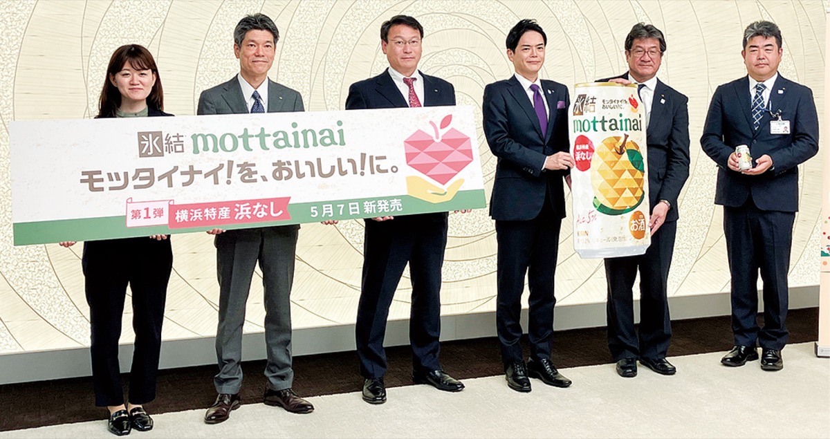 キリンビール(株)が規格外を理由に廃棄される果実を原料とした缶チューハイの新シリーズ「氷結 mottainai(モッタイナイ)」を発表し、第1弾として横浜のブランド梨「浜なし」を使用した新商品を5月7日に発売した。同日には関係者が山中竹春市長を表敬訪問し、商品をPRした。