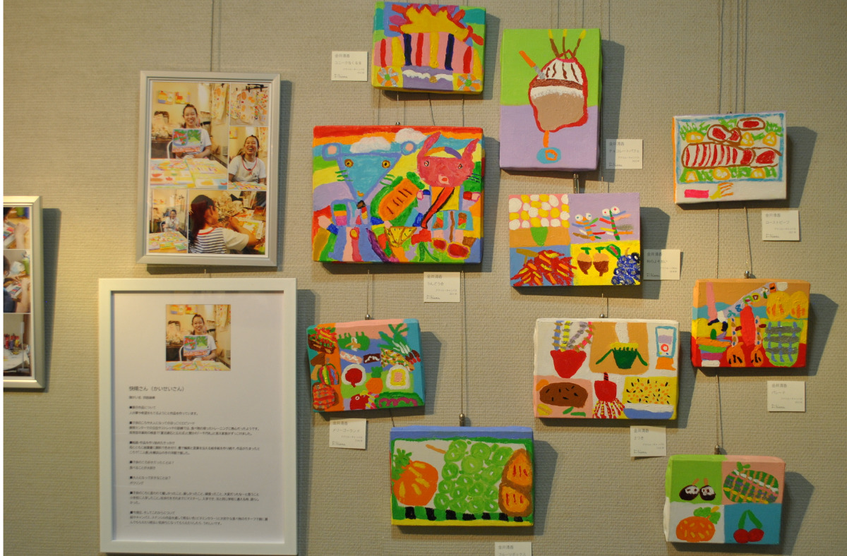 展示されているのは、大倉山駅近くにある福祉事業所アート・メープルかれんの利用者が作成した絵や刺繍50点以上。ママフォトグラファー後藤京子さんが撮影した作成風景等も並び、利用者の生き生きとした様子や日常を感じながら楽しめる。後藤京子さんは、障害のある子どもとその家族の「幸せの瞬間」を撮影するフォトグラファー。「メンバーの素敵な表情を引き出してくれた」とかれんスタッフは撮影を振り返る。