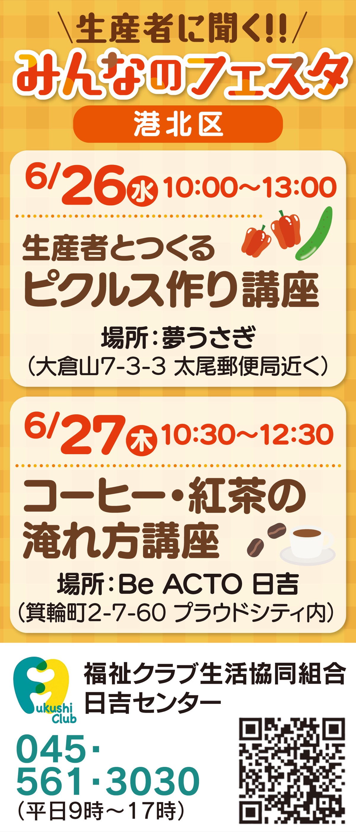 各回先着10人、事前予約制。左の二次元コードから申し込む。問い合わせは電話で福祉クラブ生協日吉センターまで。