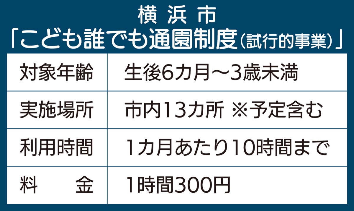 横浜市は、親が働いていなくても保育所などに子どもを預けられる「こども誰でも通園制度」の試行的事業を始めた。6月21日には実施施設や申込方法等が公表された。市は利用者の条件を「定期利用」に限定し、未就園児家庭の社会的孤立や育児負担軽減につなげていく。