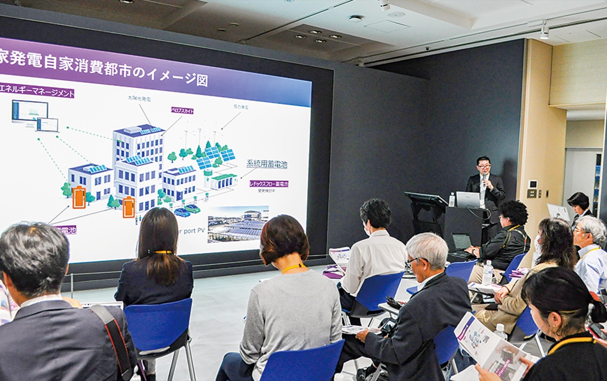 当日は大勢集まったメディア関係者らの前で、サーキュラーエコノミービジネス部部長の脇坂正臣さんらが、同社が扱う次世代型太陽電池「ペロブスカイト太陽電池」や100%リサイクル可能な自家消費用の鉛蓄電池「soldam」、エネルギーマネジメントシステム「キーセンス」などの商品を解説。実物やデータを見せながら導入事例なども紹介した。