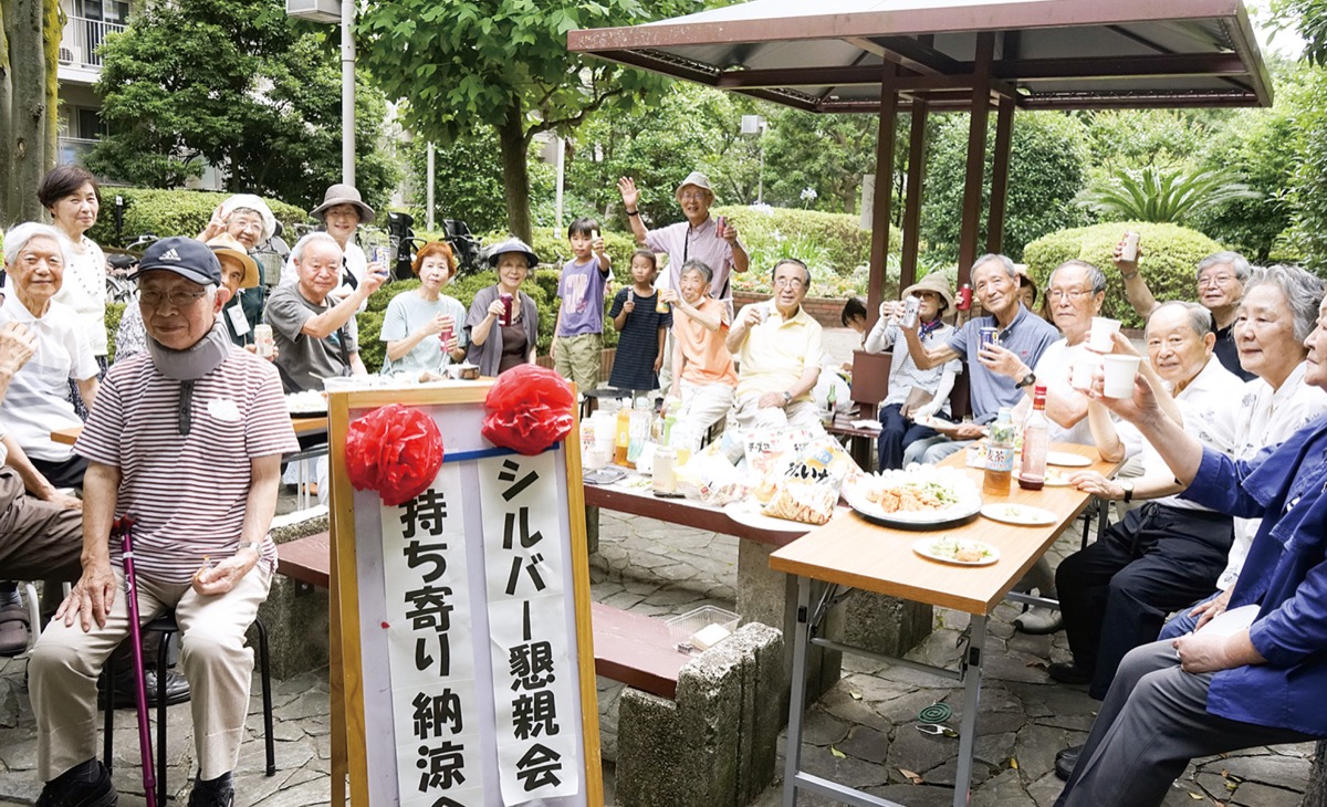 大倉山ハイム3号棟〜8号棟在住の65歳以上を中心として構成される大倉山ハイムシルバー懇親会(永野和子会長)は6月26日、大倉山ハイム5号棟南側の中庭で納涼会を開催した。