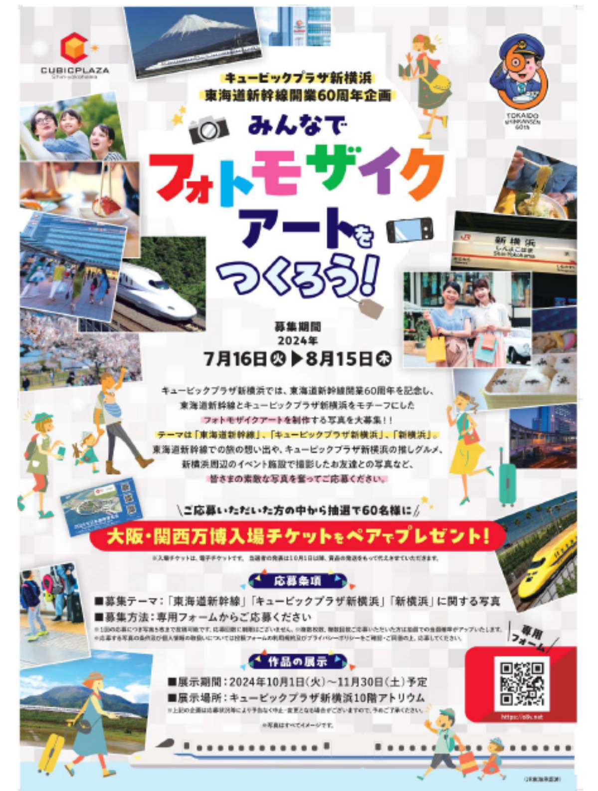 フォトモザイクアートとは、多数の写真を組み合わせて作成する画像(アート)のこと。新横浜駅に発着する東海道新幹線の開業60周年を記念したもので、募集は「東海道新幹線」や「キュービックプラザ新横浜」のほか「新横浜」に関連する写真。