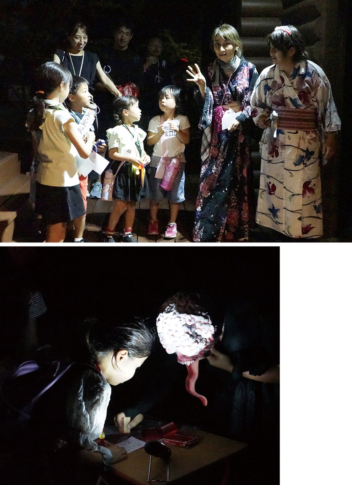 第2部はきもだめし。参加者らはグループごとに綱島地区センターを出発。約20人のお化け役が待ち受ける中、公園や墓地などを巡った。中には、悲鳴を上げたり泣いたりする子どもの姿も。