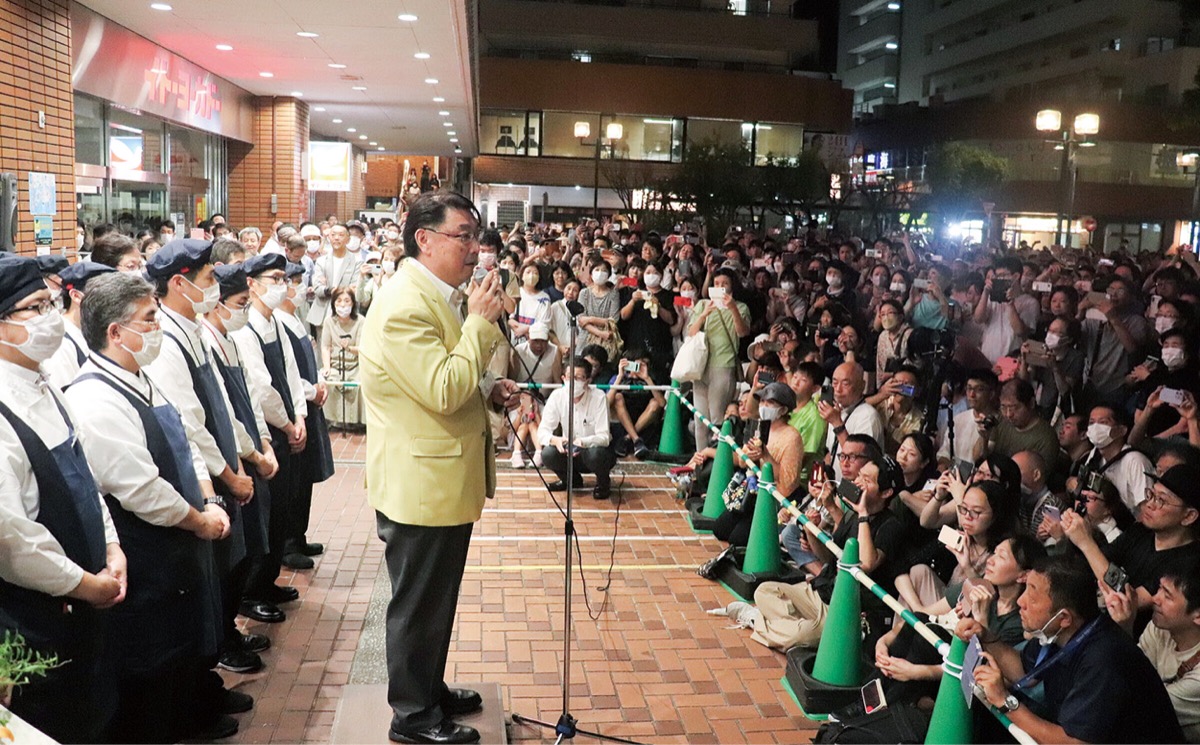 午後7時過ぎ、店前の広場は閉店の瞬間に立ち会おうと駆けつけた客らであふれかえった。閉店後に行われたセレモニーでは、同店の鈴木豊店長が「閉店はじくじたる思い。申し訳ありません」とあいさつ=下写真。店や地域交流などの思い出を振り返るとともに、長年店を支えてくれた地域の人たちや従業員に感謝を述べた。シャッターが下り始めると、居合わせた来店客などから「ありがとう」「お疲れさま」といった声があがり、割れんばかりの拍手が起きた。中には泣いているような人の姿もあった。綱島西在住の夫婦は、「妻が学生の頃にレコード店でアルバイトをしていた」と思い出を話し、「結婚後もずっと買い物や、目的がなくても来店していたので閉店は寂しい」と明かした。