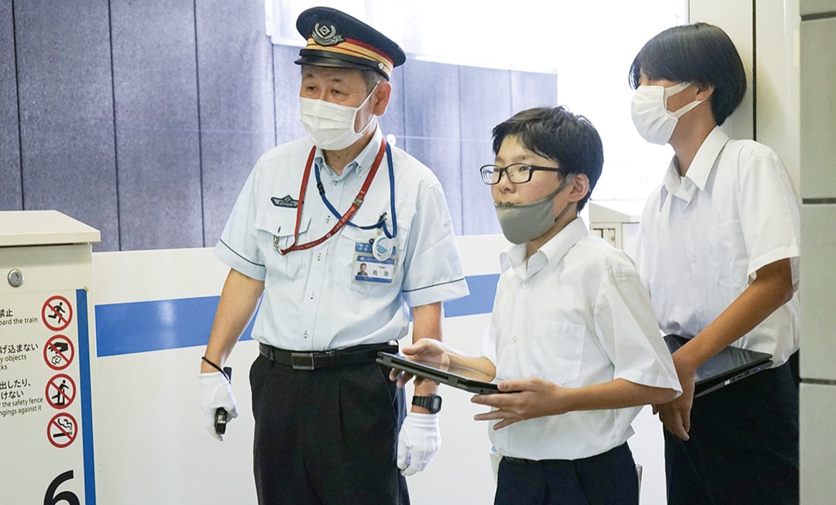 2回目の授業は現地に向かい、どこにピクトグラムが必要そうかを調査した。生徒らは、改札内外やホームなどの気になる箇所を撮影。その場で感じた疑問を、積極的に鳥海駅長に質問する姿も見られた。