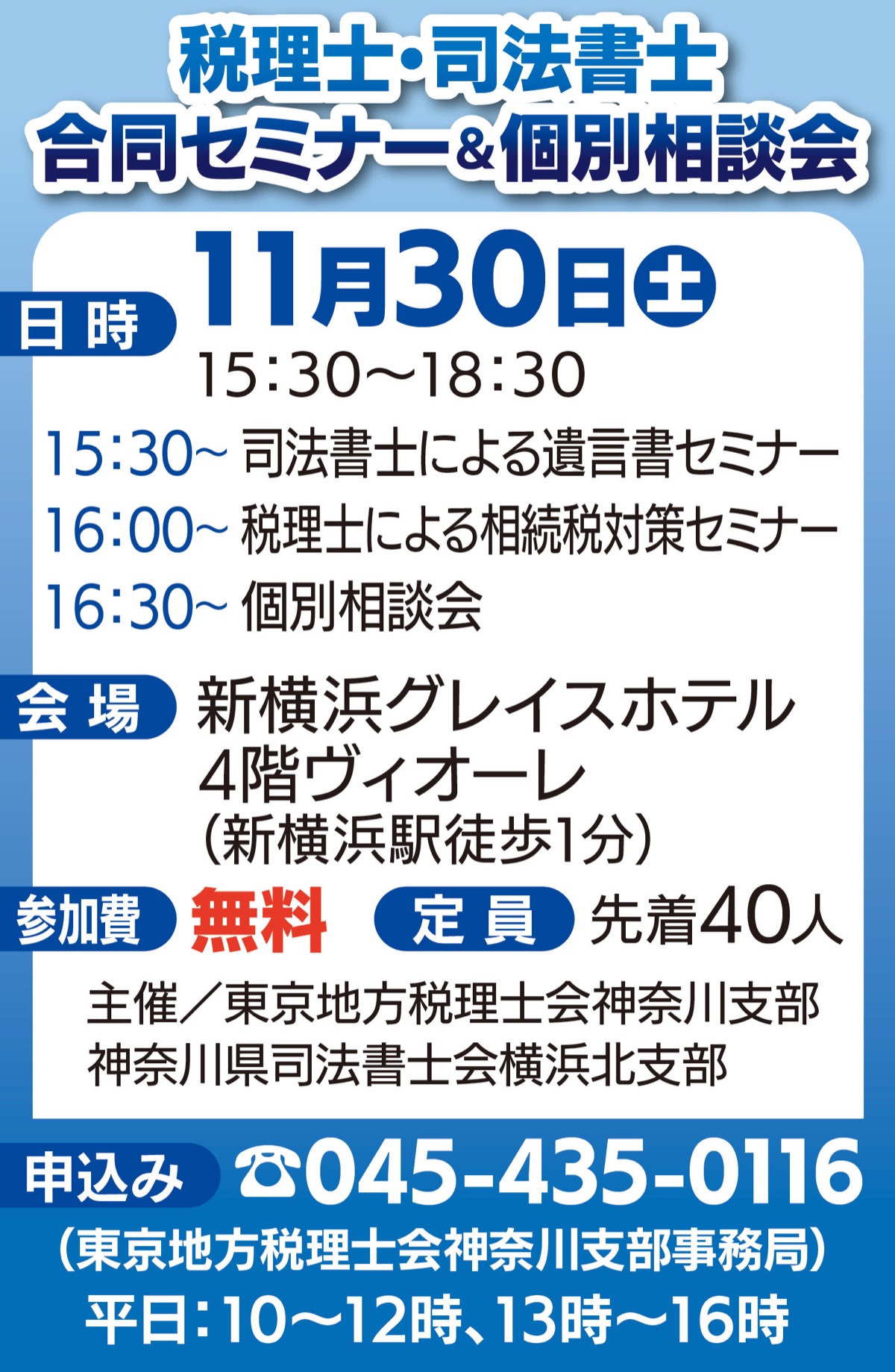 そこで東京地方税理士会神奈川支部と神奈川県司法書士会横浜北支部が協力し、11月30日(土)、相続に関する合同セミナー&個別相談会を初開催する。会場は新横浜グレイスホテル。定員は先着40人。参加はセミナー、個別相談会どちらかだけでも可。参加希望者は左記まで連絡のこと。定員になり次第締切り。