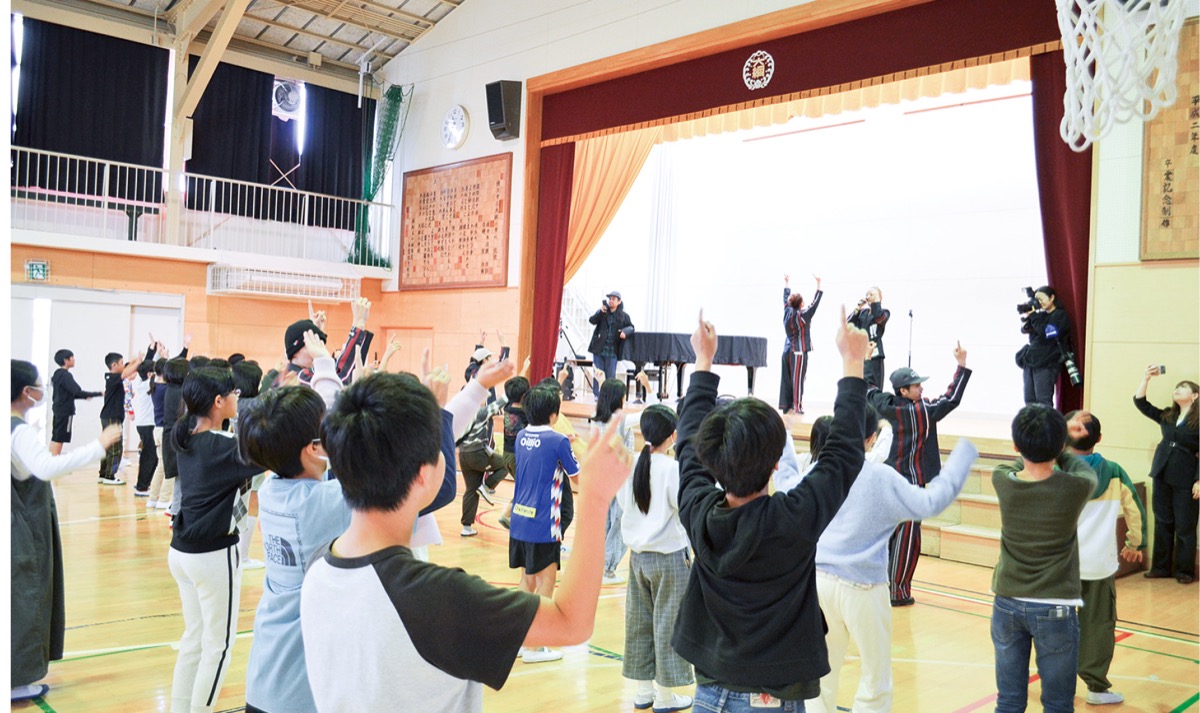 同小学校近くに構えるダンススタジオ代表の高橋晋さん=人物風土記で紹介=が、チーフアドバイザーを務めるダンスチーム「dip BATTLES」を率いて登場。早々に迫力のあるダンスを披露し、児童を圧倒した=左上写真。