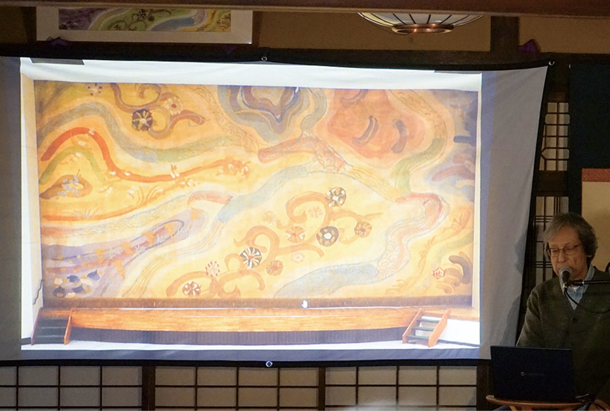 イベントは2部制で、1部は大野代表とメンバーの田邊陵光さん、阿部知行さんがそれぞれ、芹沢氏や、緞帳に描かれた鶴見川など作品にまつわる講演を行った。2部では、同館散策を実施。