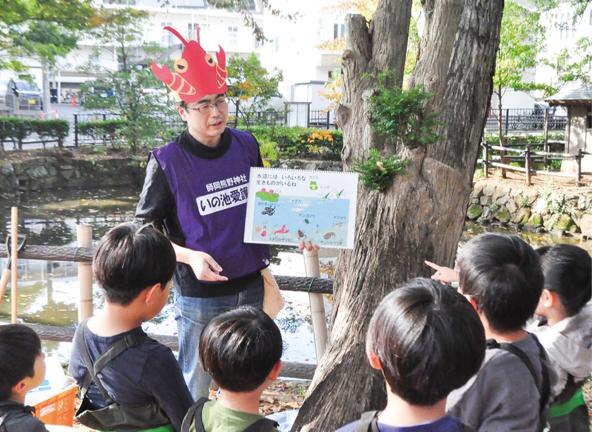 同会設立に携わり、前会長を務めた同神社総代会長の鈴木聡さんは「土や落ち葉を裏山に返すことで、山の保水力が上がり、良い湧き水が出る循環を生む。地域の皆で自然を守る大事な作業」と話す。児童らに池の中の生態系などを教える紙芝居を行った同会の吉野議章さんは「子どもたちの良い思い出になり、自分たちで地域を守っていこうという気持ちにつながれば」と感想を述べた。