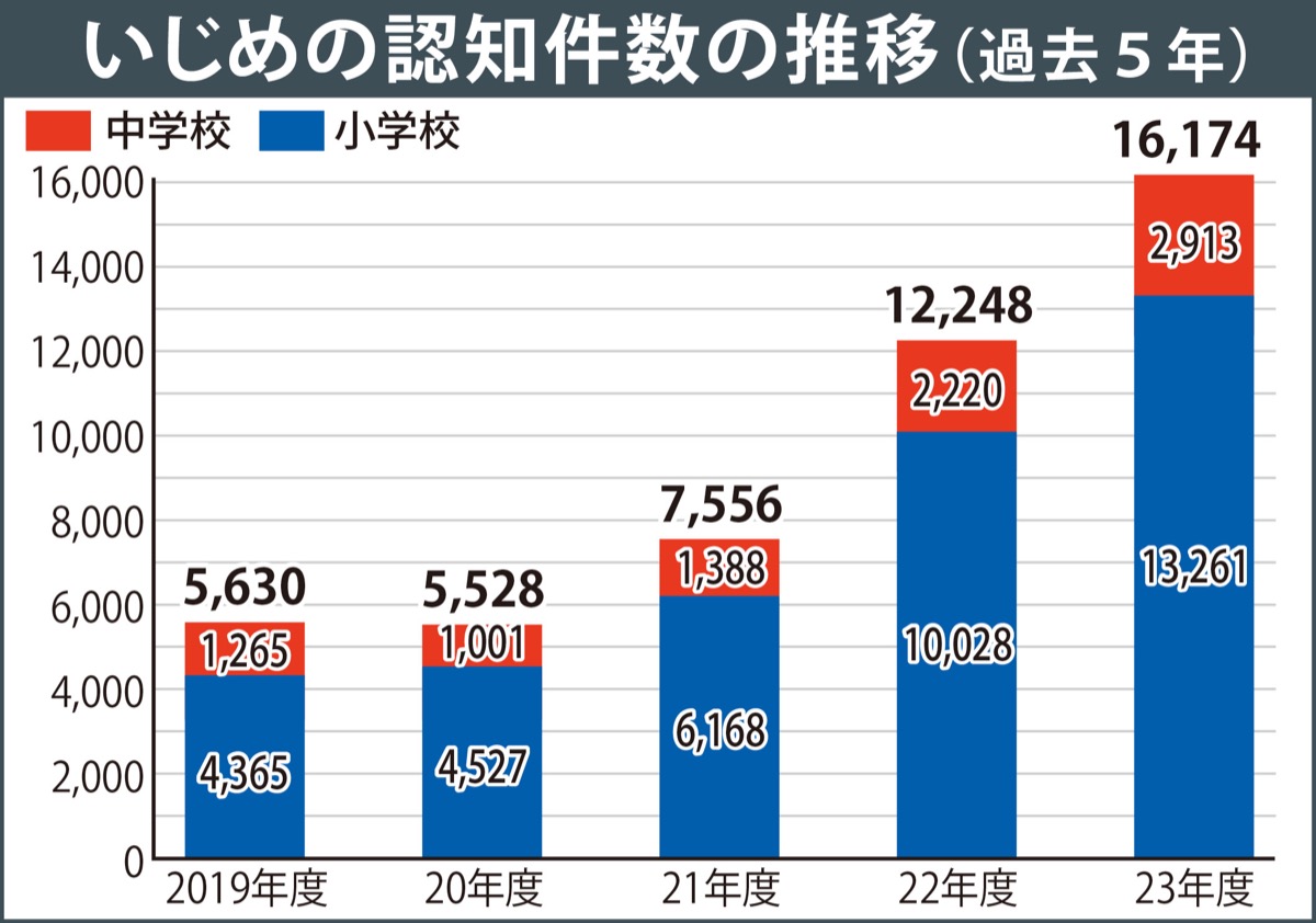 いじめの認知件数は小中学校ともに過去最多を記録。小学校では前年比32・2%増の1万3261件、中学校では前年比31・2%増の2913件だった。