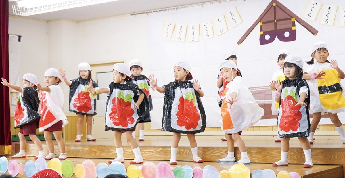 園児らが選曲し、小道具を自作、年長クラスは振り付けを考えるなど、子どもが主体となっている。すしをイメージした衣装を身にまとった踊り=写真、アイドルをテーマにした踊りなどを披露。劇では日常でのやりとりを入れながら、「クリスマスプレゼントを作る小人」を演じた。