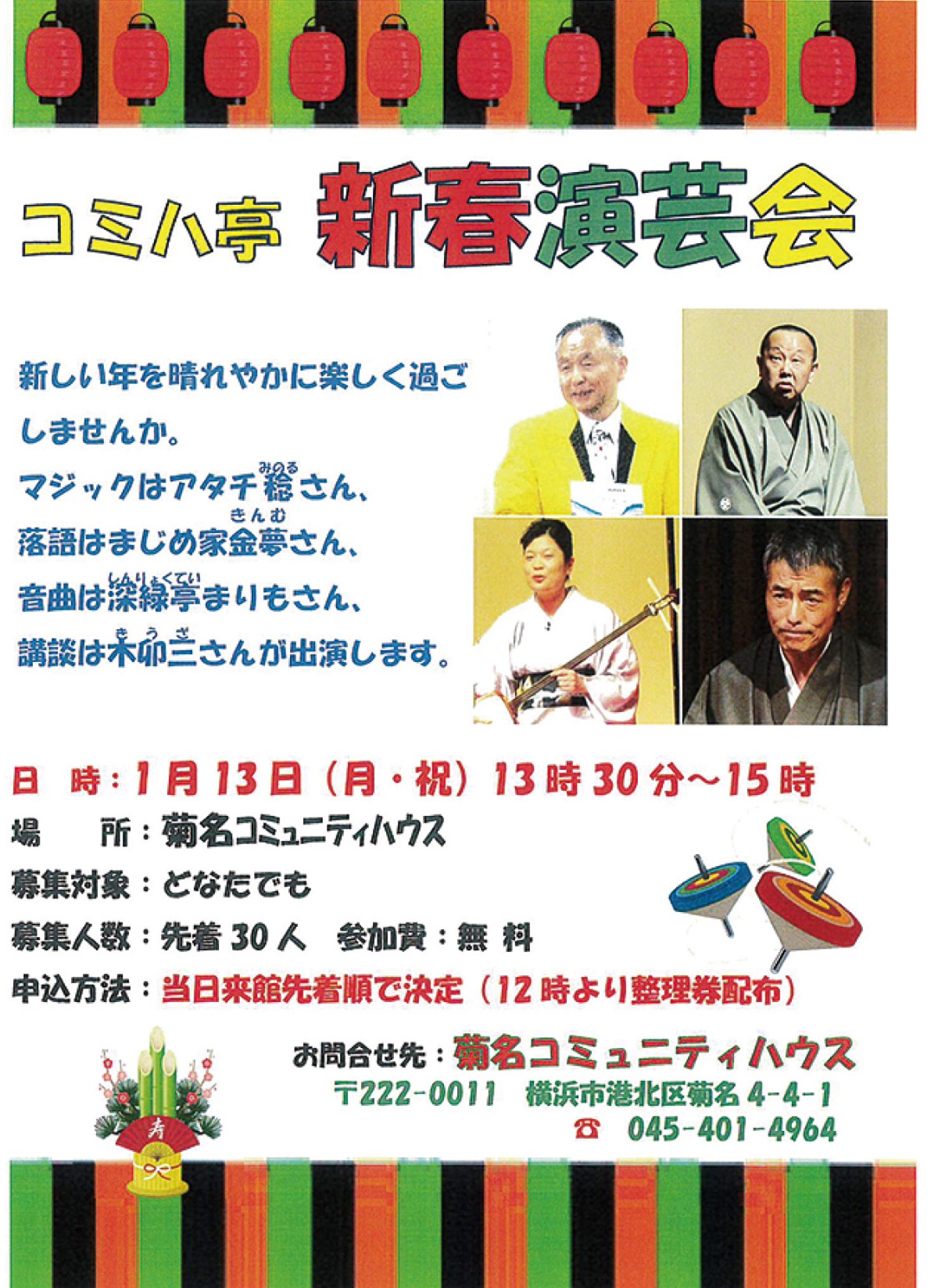 菊名コミュニティハウス(菊名4の4の1)で1月13日(月)、「コミハ亭 新春演芸会」が開催される。午後1時30分から午後3時まで。定員30人(当日正午から整理券配布開始。来館先着順で決定)。観覧無料。募集対象は、誰でも可。