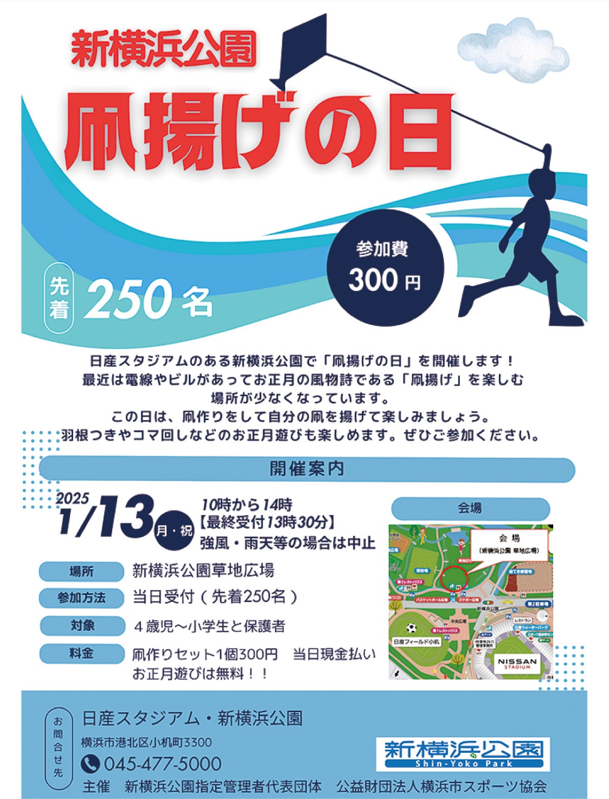 新横浜公園で1月13日(月)、「凧揚げの日」が開催される。主催は、新横浜公園指定管理者代表団体・(公財)横浜市スポーツ協会。
