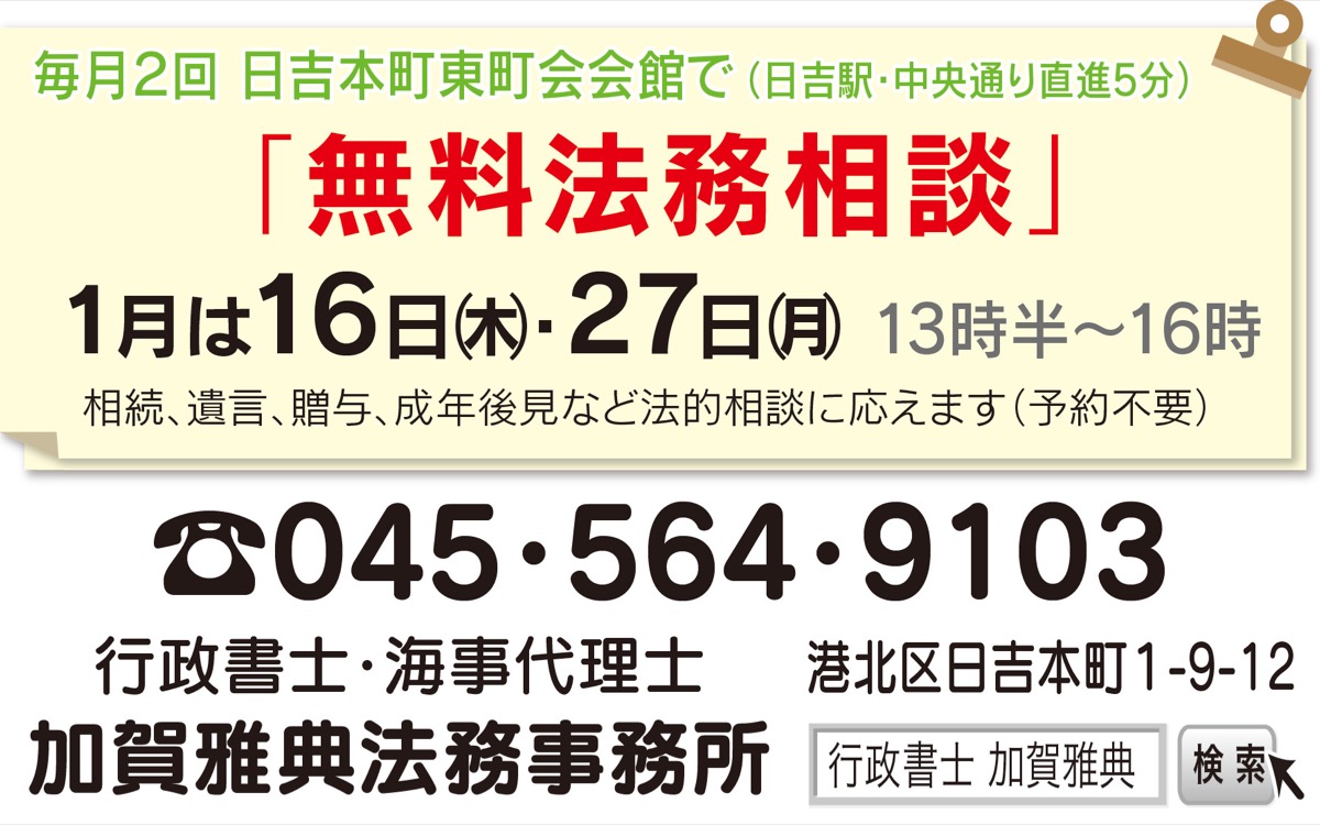 また、「悩み事をどこに相談すればよいのか分からない人たちの力になれれば」と、地元・日吉で17年以上続けている月2回の無料法務相談は、予約不要で気軽に悩みを相談できると好評だ。今月は、1月16日(木)、27日(月)に開催する。会場は、日吉本町東町会会館(日吉駅・中央通り直進5分)。午後1時30分〜4時。