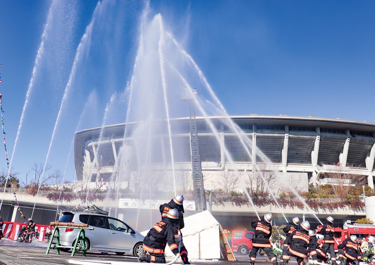 式典は、同実行委員会の委員長を務めた関治美港北区連合町内会会長の「出初式は地域の人の防災意識を一層高める重要な行事。これを機に区が一丸となり防火・防災に務めてまいりましょう」という宣言で開式。永年勤続消防団員や一般消防功労者などの表彰があった。また、区内の消防車が一堂に会した車両分列行進では、見学に訪れた子どもたちが目を輝かせて喜んでいた。続いて地域の各団体によるお囃子・獅子舞、古式消防演技、鼓隊や和太鼓の演奏が披露され、会場を沸かしていた。その後、署員、団員らによる総合訓練が行われ、締めとなる一斉放水が行われると、その迫力に来場者は拍手や歓声を上げていた。