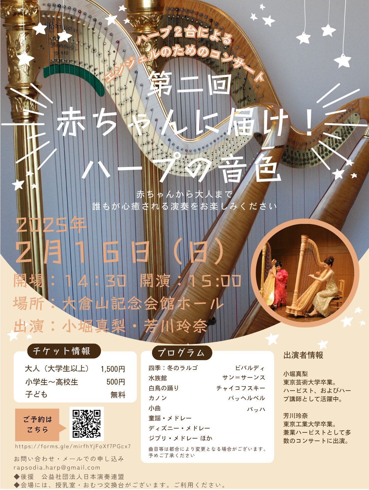 チケットは大学生以上1500円、小中高生500円、子ども無料。問い合わせ、予約はメール【メール】rapsodia.harp@gmail.comへ。