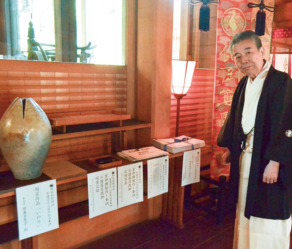 師岡町在住の陶芸家、横溝多恵子さんは、「ほころび、花を咲かせる」ことを願い、陶芸作品『いのり』を奉納し、式では「(創建1300年の)この時代に居合わせて光栄」とあいさつした。