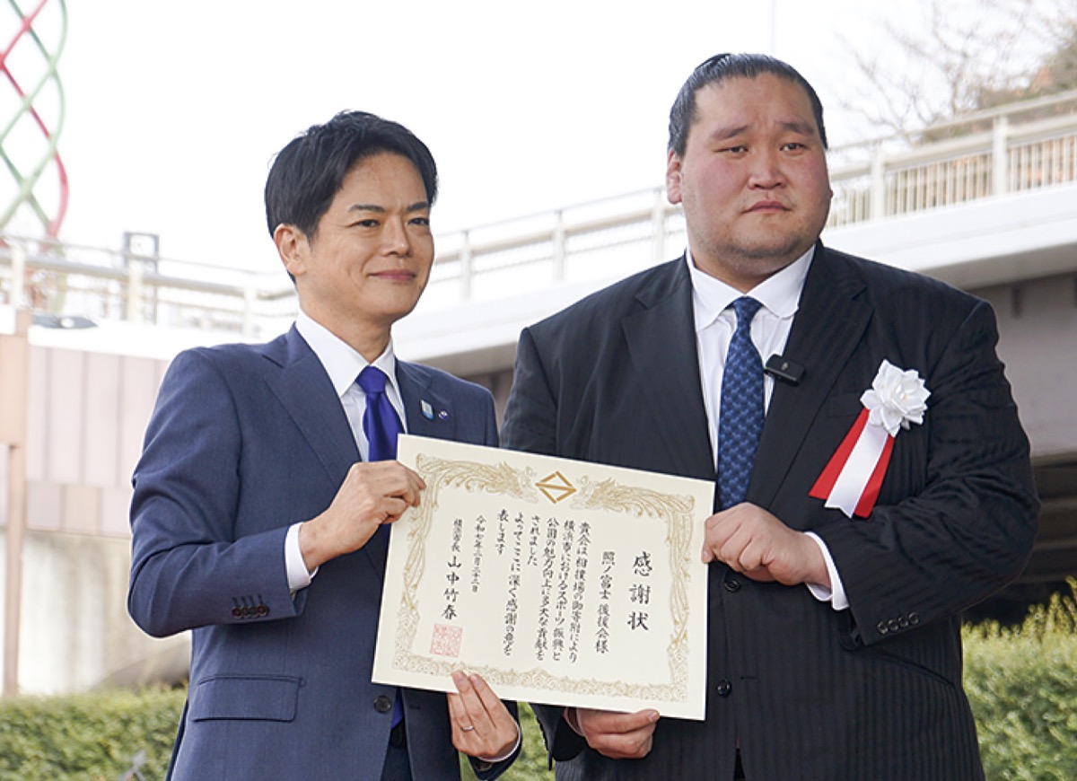 式典では、寄贈を受けた山中竹春市長が照ノ富士親方に感謝の意を示し、「港北区は子ども相撲大会が行われるなど相撲が盛んな地域。この相撲場が子どもたちの成長と交流の場になれば」と口にした。