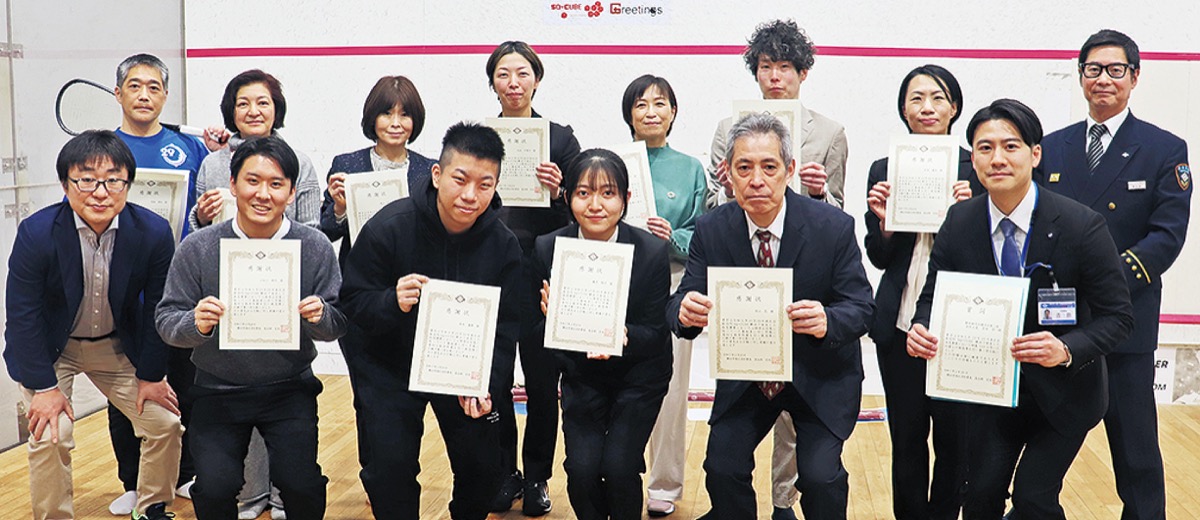 長谷部署長は「救急車の到着までに救命処置をすることで、1カ月後の生存確率が2倍、社会復帰は3倍になります。仲間のために勇気をもって対応してくれて、感謝します」と述べた。当日、仲間の前に元気な姿を見せた高橋さんは「このように社会復帰でき、スカッシュができるまでに回復しました。本当にありがとうございました」と感謝を伝えた。