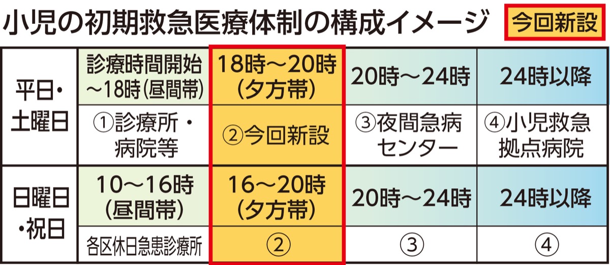 横浜市によると、救急相談センター(#7119)の小児に関する医療機関案内の入電件数は午後6時から8時にかけてピークを迎えるなど、小児医療のニーズは夕方時間帯に高まる。しかし、この時間帯は診療を終えている診療所等が多く、市内3カ所の夜間急病センターも診療開始前で、急病の小児医療体制の狭間となっている。
