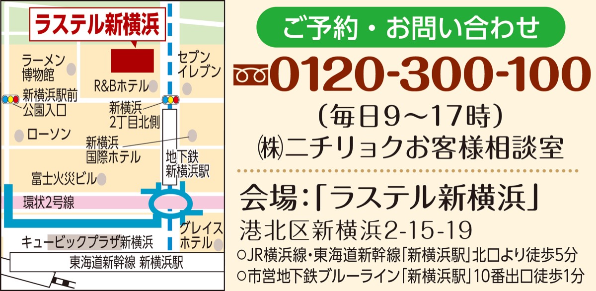 新横浜駅北口10番出口徒歩1分の場所にある「ラステル新横浜」は、葬儀やお墓、終活などをトータルで提供する株式会社ニチリョクが運営する葬儀式場。葬儀だけでなくお墓探しから墓じまいまで、幅広く受け付けている。