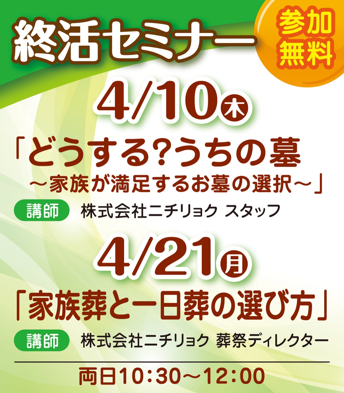 4月10日(木)は「どうする?うちのお墓〜家族が満足するお墓の選択〜」がテーマ。同社スタッフが講師となり、お墓の種類や希望に合うお墓の選び方等幅広く説明。様々なお墓に関する悩みや相談にも対応する。午前10時30分から正午まで。
