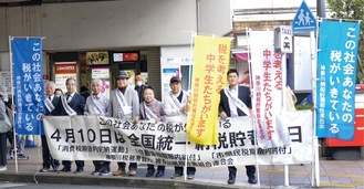港北区と神奈川区を管轄する神奈川納税貯蓄組合連合会(石川圀光会長)は4月9日、大倉山駅で横断幕を掲げ、納税の啓発活動を行った。
