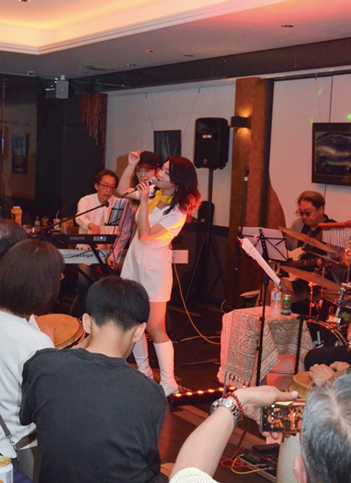 4月19日には、ロータスパーティとして4回目となるイベントが行われ、およそ50人が会場に集った。披露されたのは、ヨーデル愛好会、小山義和さんの生演奏や、昭和歌謡を中心とした歌唱など。ゲストボーカルは、神奈川や東京を中心にダンサー、シンガーなどとして活動する踊るミエさん。その歌声が会場に響き渡ると、一際大きな拍手と歓声が上がっていた=写真。