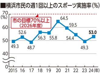 横浜市は2024年度の市民スポーツ意識調査の結果を4月23日に公表した。この中で週1回以上スポーツをしている人は53・0%で23年度から上昇したものの、市が26年度の達成目標としている70%には依然として差があることが分かった。