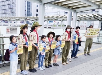 ボーイスカウト横浜第8団(中島一郎団委員長)は4月20日、新横浜駅前で大船渡市山林火災、能登半島地震・豪雨災害に対する義援金の募金活動を行った。