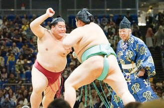 横浜アリーナ場所は、伝統文化に触れ合い、楽しんでもらうことを目的としている。今年は9000人が来場し、迫力のある取組に熱中する様子が見られた。土俵の上にある大型ビジョンには力士の表情まで映し出され、くぎ付けになる人も。港北区出身の幕下・鳩岡らと、綱島少年相撲軍団や港南相撲クラブの子どもたちとの稽古には、温かな視線が送られたほか、巡業でしか行われない初切(しょっきり)や相撲甚句なども行われ、会場は笑いに包まれた。
