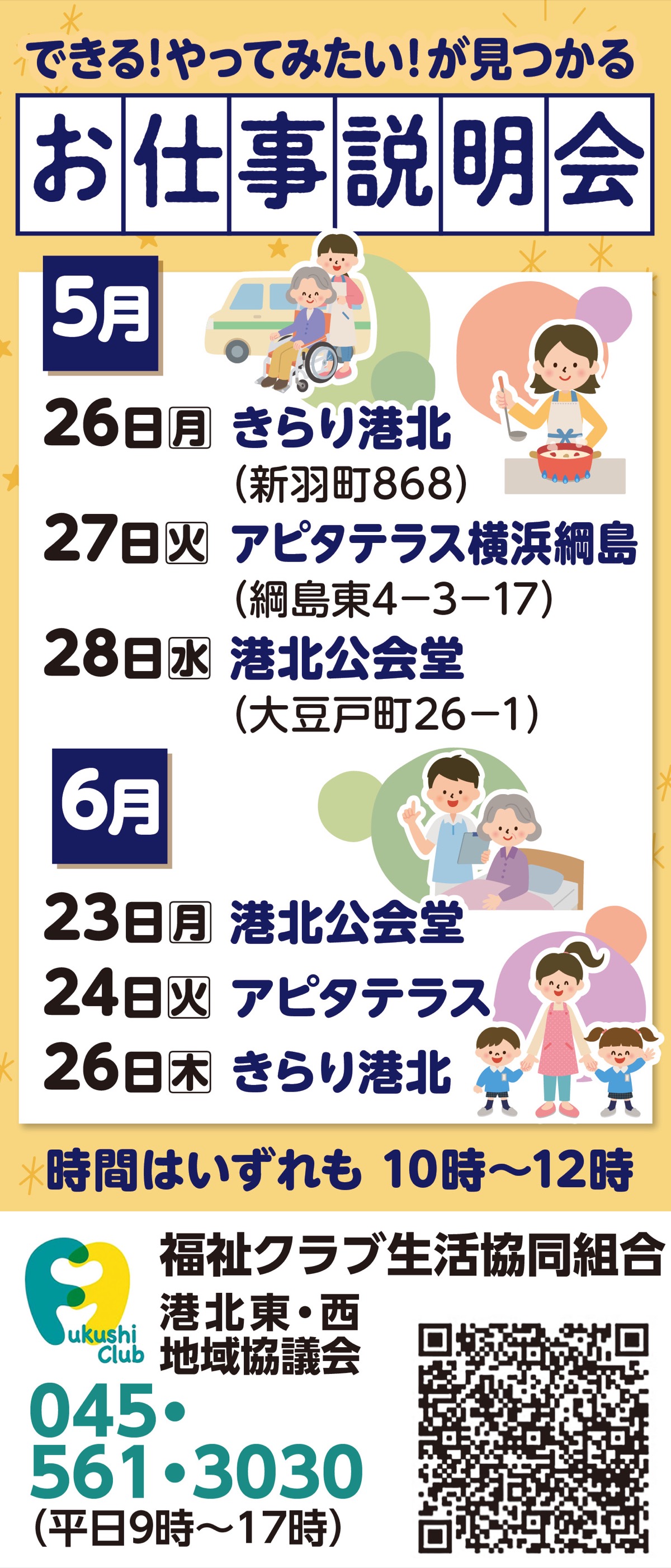 いつまでも住み慣れた地域で住み続けられるよう、35年間、地域の「たすけあい」を拡げてきた福祉クラブ生協は5月、6月に「お仕事説明会」を開催する。