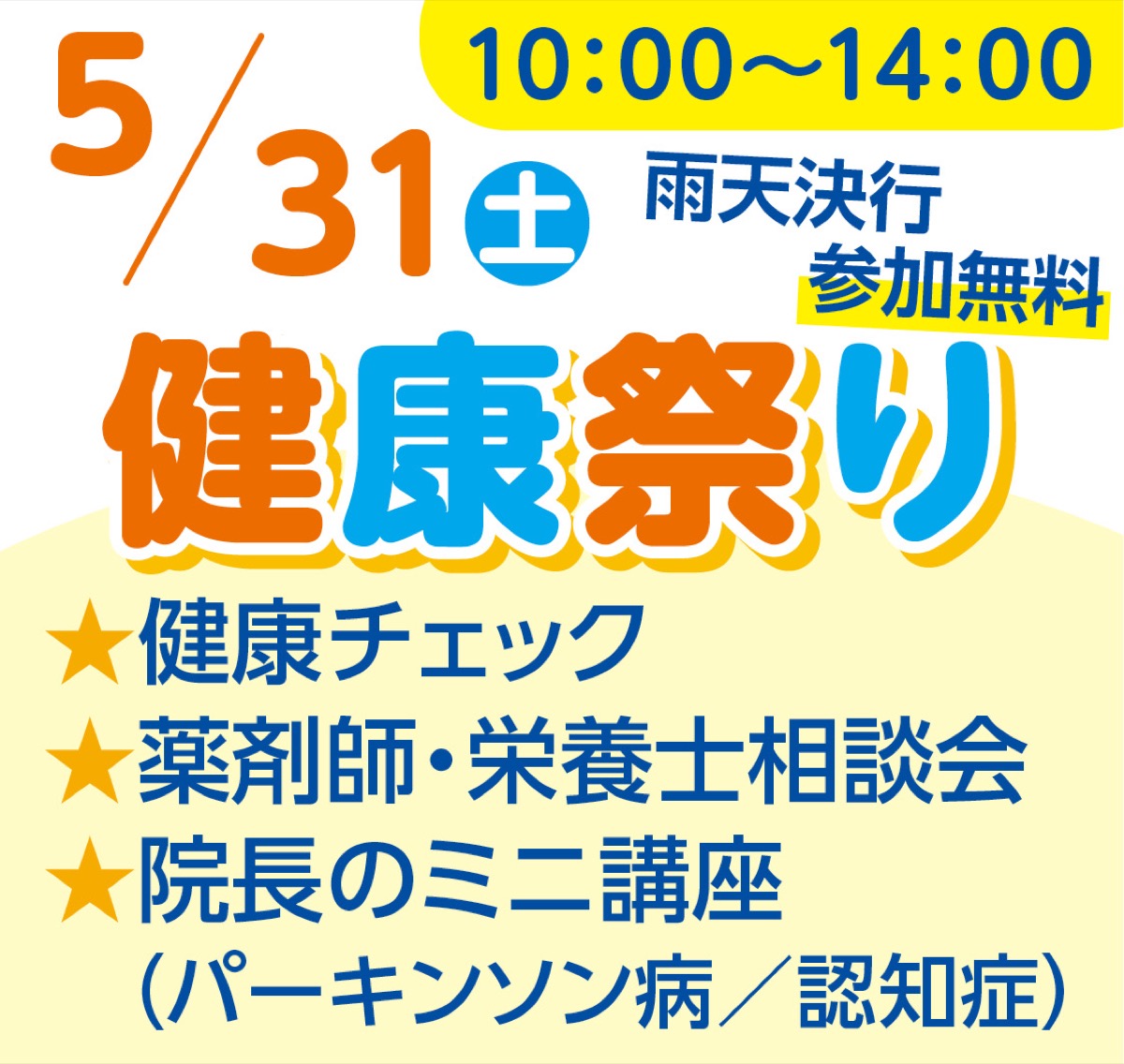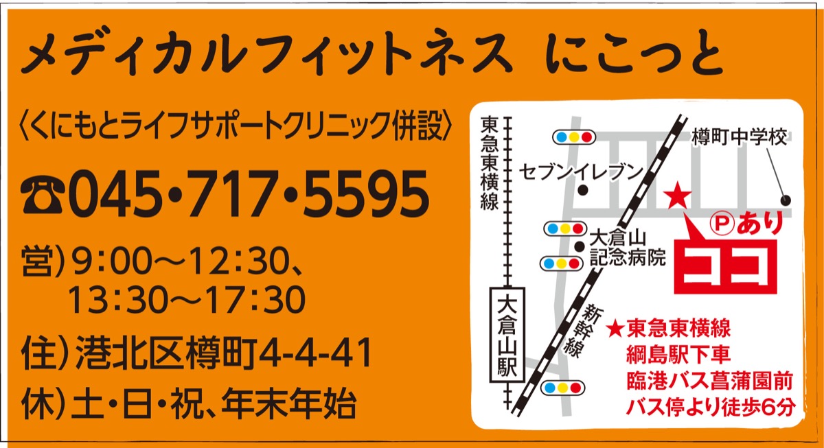 「くにもとライフサポートクリニック」併設施設のメディカルフィットネス「にこっと」で、5月31日(土)に健康祭りが開催される。パーキンソン病患者を対象としたクラスの体験会や無料健康体操を実施。骨健康度・脳年齢・血管年齢が測定できるサンドラッググループ薬剤師の健康チェックのほか國本院長によるパーキンソン病、認知症に関するミニ講座やワンコインハンドセラピー(先着5人)など盛り沢山。気軽に参加を。