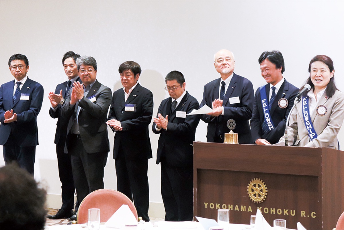 今年の例会のホストクラブである横浜港北RCの井上恵会長による点鐘で開会。国歌、ロータリーソングの斉唱の後、各クラブの近況報告や次年度会長・幹事の紹介などが行われた。地区内の各クラブを指揮する次年度のガバナー補佐には、横浜北RCの森和夫さんが就任し、その発表と就任あいさつが行われた。