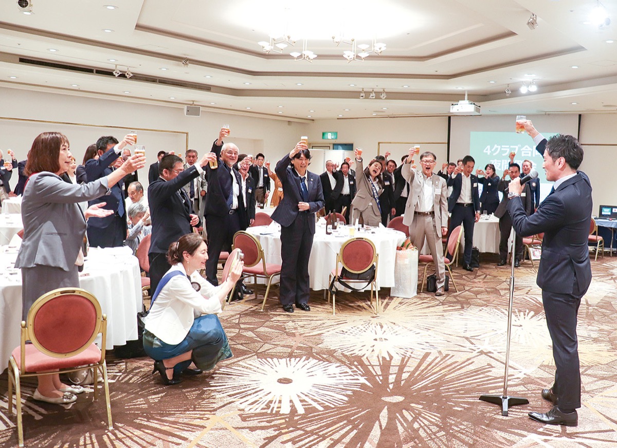 社会奉仕団体として地域で活動しているロータリークラブ(RC)。港北区を中心に活動する4クラブ(横浜港北RC、横浜北RC、横浜都筑RC、横浜日吉RC)合同の夜間例会が5月22日、新横浜プリンスホテルの宴会場で行われ、各クラブの会長、幹事や会員ら約80人が集まった。
