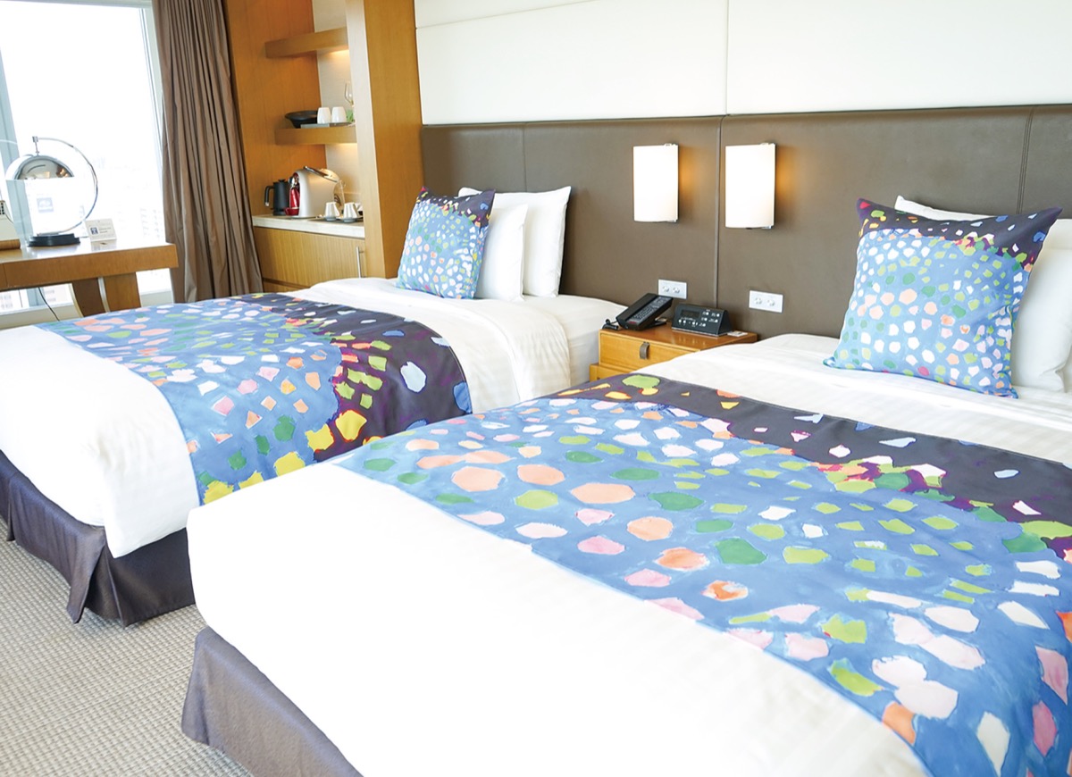 (社福)アート・メープルかれん=大倉山=や(社福)アール・ド・ヴィーヴル=小田原市=に所属する障害のある作家の作品を用いたベッドスローやクッション、壁掛けアートなどで客室を華やかに彩っている。